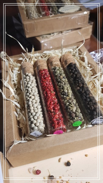 This set includes four types of peppercorns along with a pamphlet of how to use each pepper.